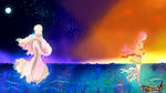 夕方から宵に変化していく色合いの中で、立つ位置、向かう場所。当初から具体的な構図が頭の中にあって、能力の限りを尽くしてリクエスト文に詰め込みました。それらを春霞のようににじむ色彩で、すばらしく雰囲気のある作品に仕上げていただきました。