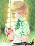 きっちり首元をしめたシェフコートとネクタイ姿は、ホシ様の穏やかで繊細な絵柄とあいまって、柔らかな光の差し込む、まさに静穏なたたずまいにしていただきました。午後のおやつの準備をしているひとときでしょうか。リクエストしたのがイチゴの時期だったので、お菓子より青果がいいと思って指定させてもらいました。くるくるリンゴ剥きって優しくていいですね。