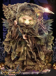 クラッシュ率あがりそうな、これでもかと布とフリルを重ねていただいて大感激です。リクエスト内に特に明記したわけでもないのに右手はしっかり布を掴んでいたり、ひらりと翻る肩布がさりげなく片羽に見えたりと、お心遣いしていただいた部分がPCにぴったり。さらに他イラストのモチーフまでアレンジしていただいているのにも感激しました。